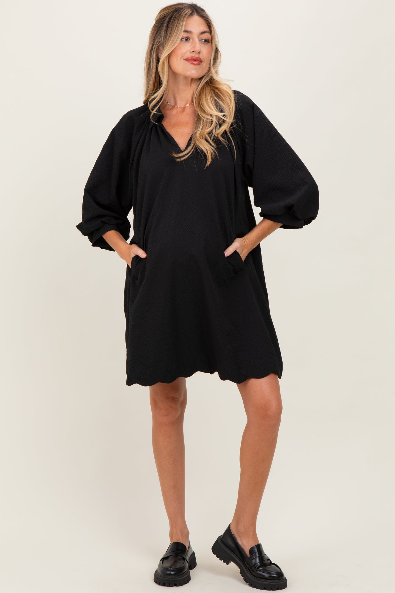 Elevate your maternity style with our Black Textured Collared 3/4 Puff Sleeve Maternity Dress. This chic, versatile dress features a sophisticated collared neckline and on-trend, puffed 3/4 sleeves for a modern twist. The textured fabric adds subtle dimension, while the relaxed fit and flowy silhouette ensure all-day comfort as your bump grows. Perfect for work, baby shower, or date night, this dress offers both fashion and function. Pair it with flats for a casual look, or dress it up with heels and accessories. Stay on trend and comfortable throughout your pregnancy with this timeless wardrobe staple!