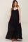 A solid tiered maternity maxi dress with adjustable straps. Dress is double lined. Pocketed.
