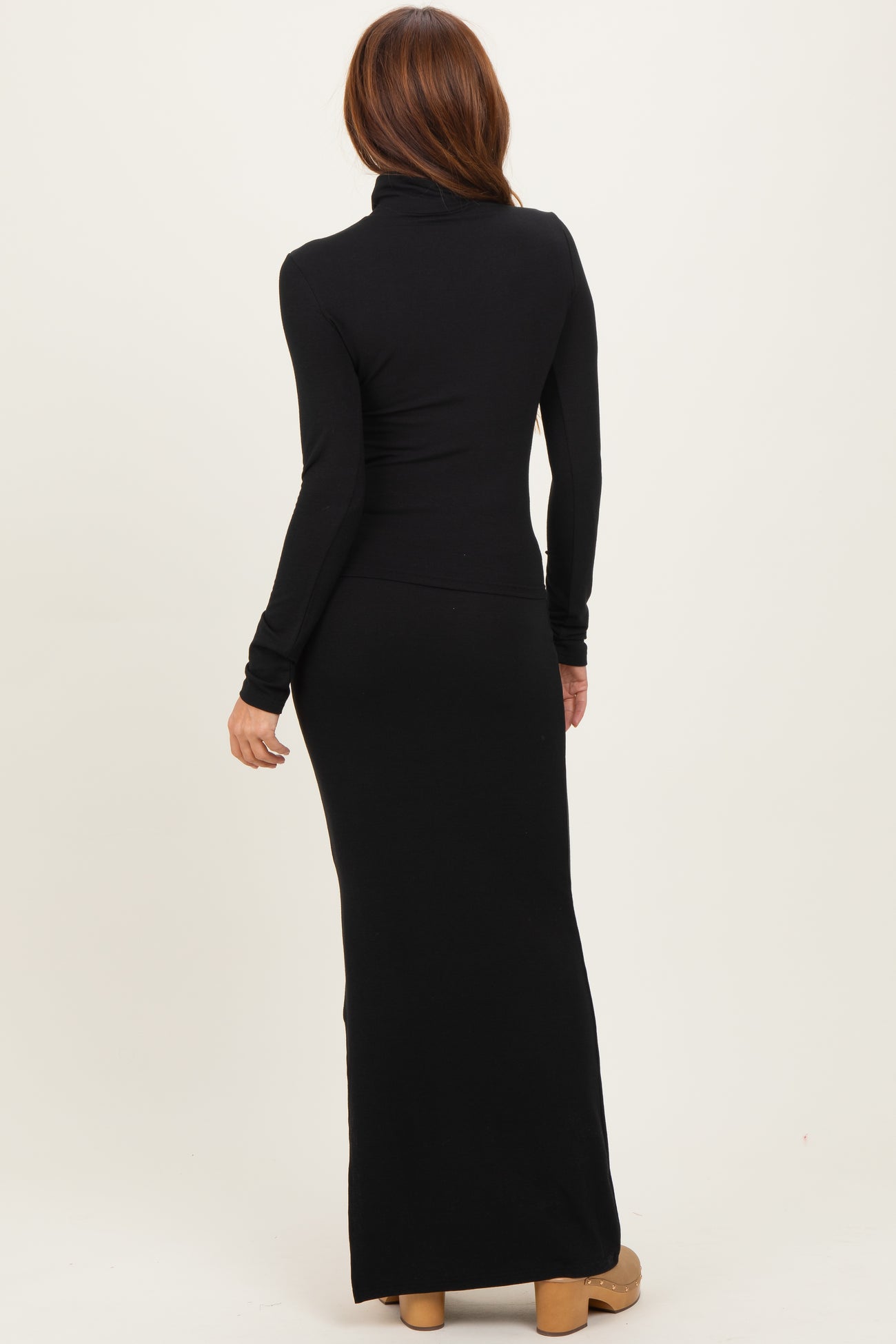 Elevate your wardrobe with this Black Turtleneck Top and Maxi Skirt Set. Featuring a sleek, form-fitting turtleneck with long sleeves, this top offers timeless elegance and cozy comfort. The matching maxi skirt flows gracefully to the ankle, highlighted by a subtle side slit for a touch of sophistication and ease of movement. Crafted from a soft, stretchy fabric, this set ensures a flattering fit while keeping you comfortable all day long. Perfect for casual outings, work, or evening events, this versatile two-piece set is a chic addition to any woman's collection. Pair with your favorite heels or boots to complete the look.