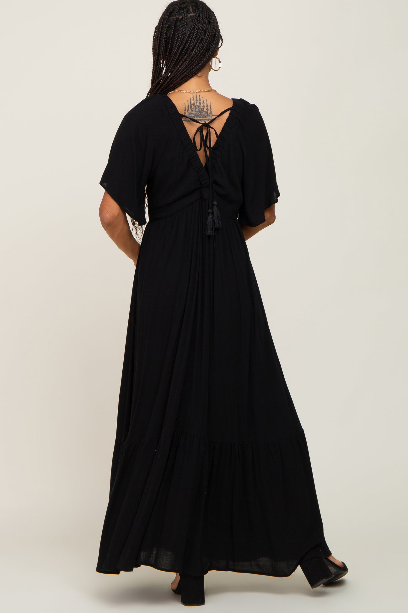 A solid hue maxi featuring a v-neckline, short flounce sleeves, a back tie, and a gathered bottom tier. Dress is lined.