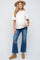 A pair of maternity jeans featuring 5 pockets, ankle length flared legs, a distressed knee, an elastic belly band, and distressed accents along the pocket seams and bottom hem.