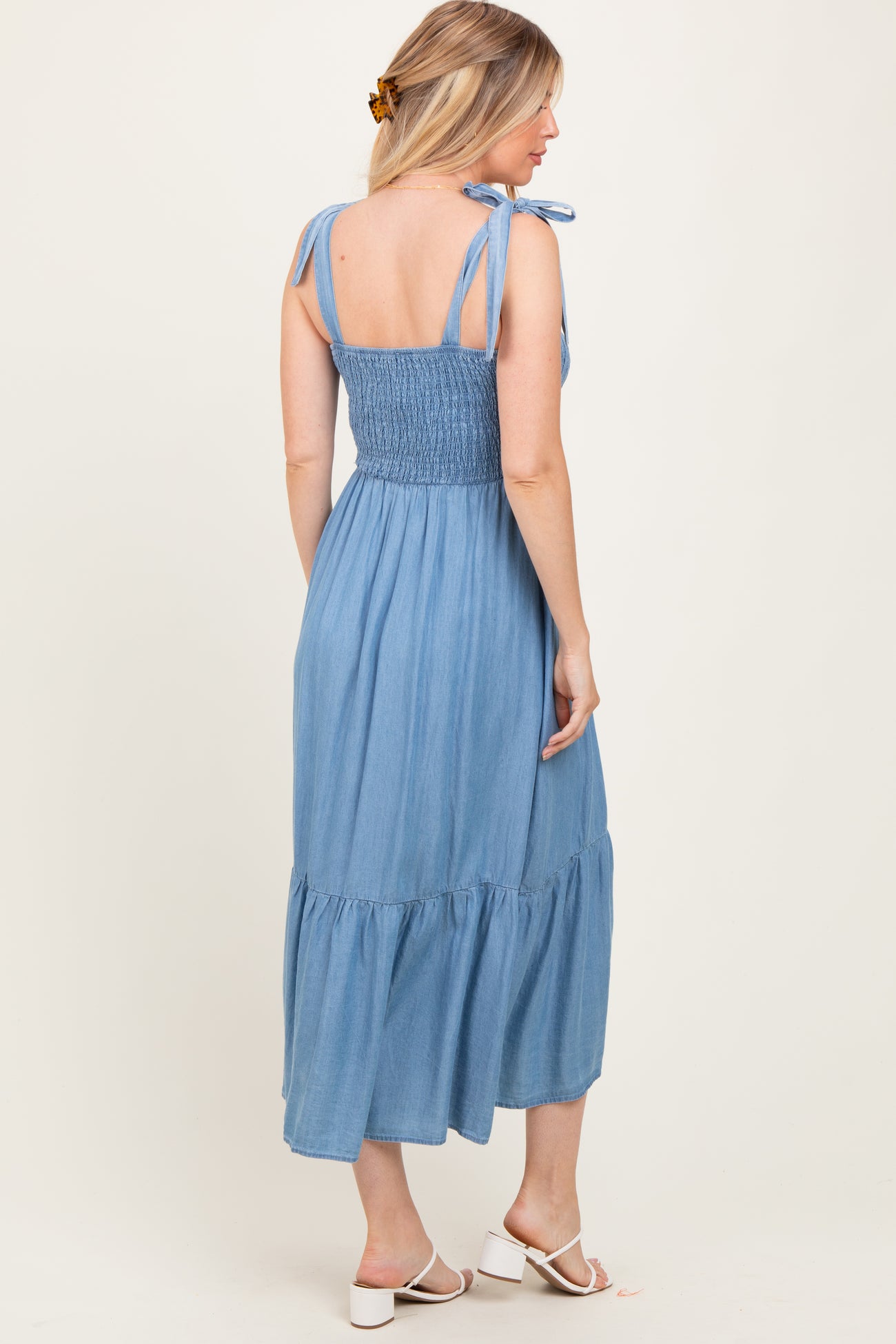 Blue Chambray Smocked Shoulder Tie Maternity Maxi Dress