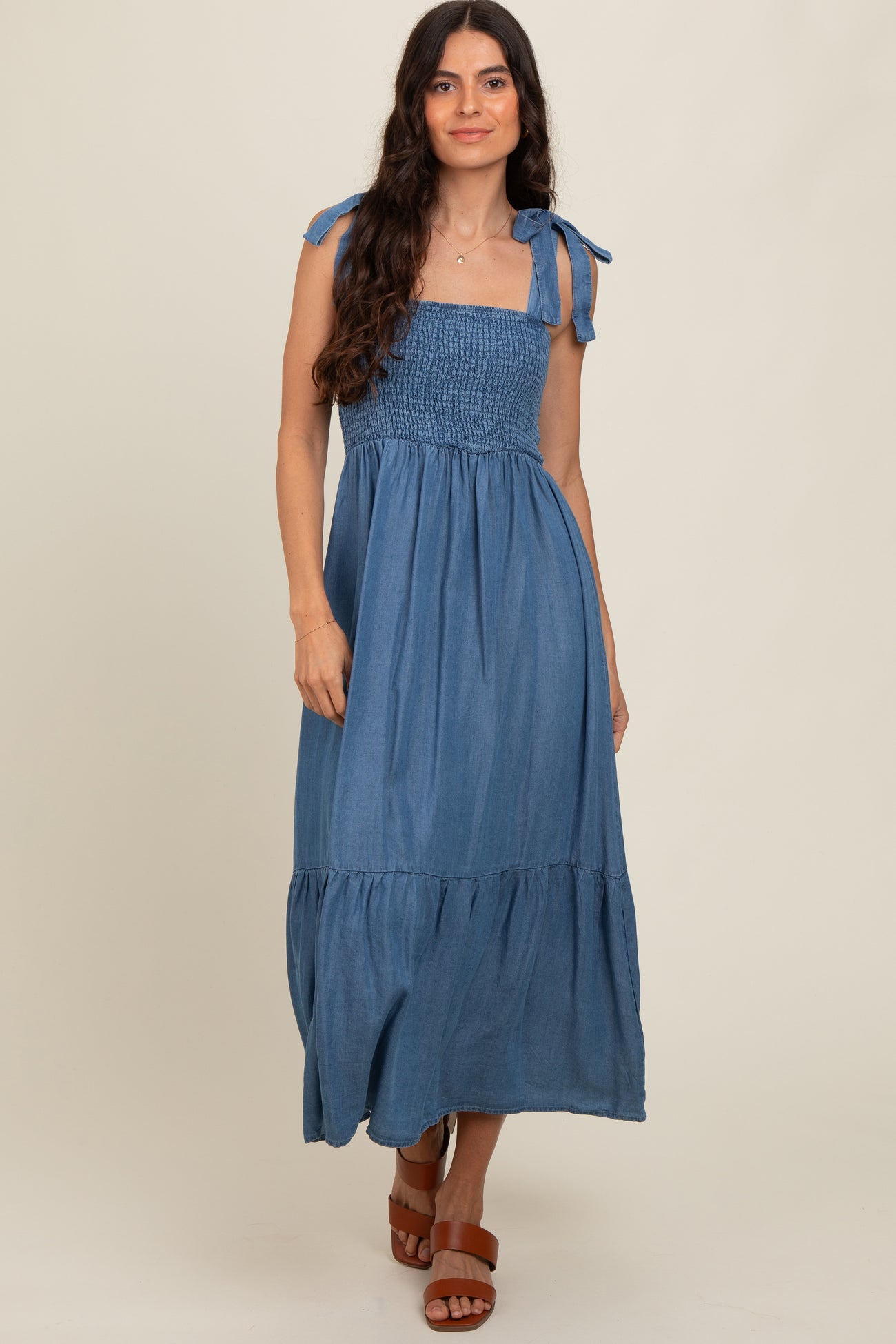 Blue Chambray Smocked Square Neck Shoulder Tie Midi Dress