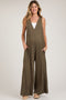 A pair of denim overalls with adjustable straps, a front pocket, side button closures, and side pockets.
