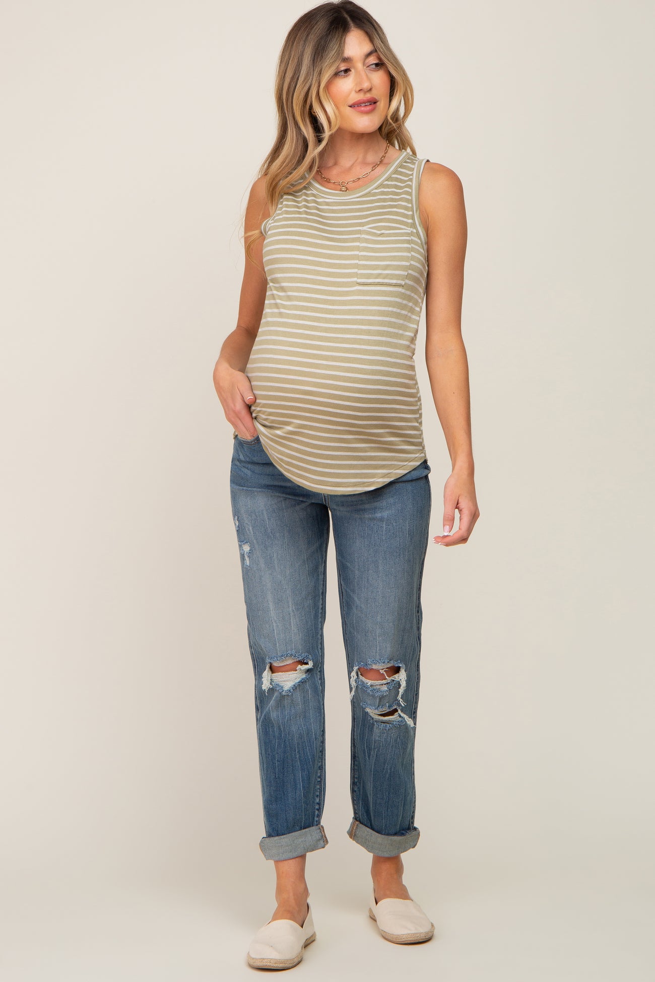 Blue Distressed Knee Rolled Hem Maternity Straight Leg Jeans
