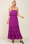 A floral print chiffon dress with a mock neck, flutter sleeves and tiered body. Dress is double lined. Keyhole and button closure in back.