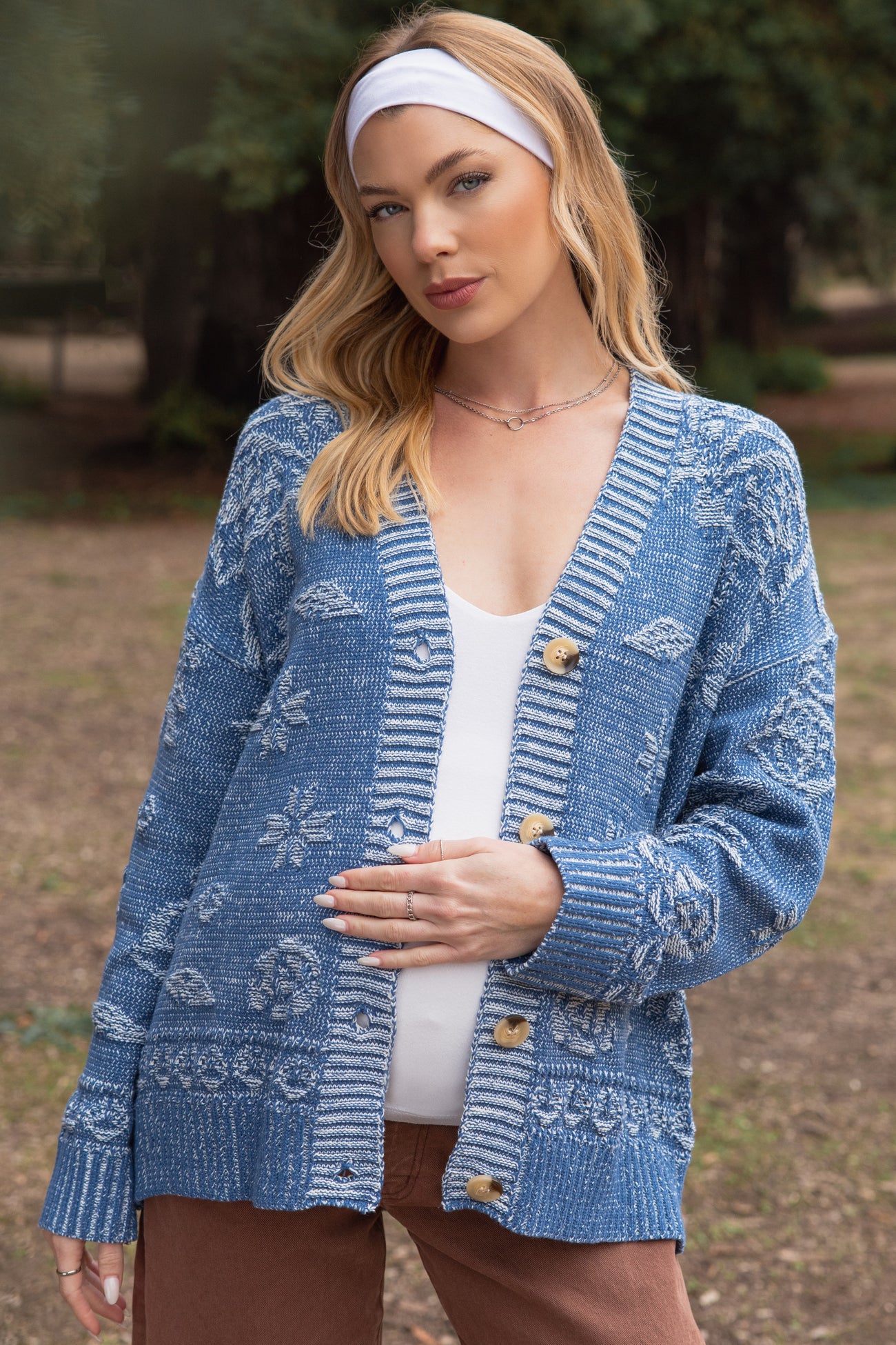 Stay cozy and stylish throughout your pregnancy with our Blue Floral Knit Maternity Button Cardigan. Crafted from a soft, breathable knit fabric, this cardigan features a charming floral pattern in soothing blue tones, perfectly complementing your maternity wardrobe. The relaxed fit and button-down front provide easy layering and accommodate your growing bump comfortably. Ribbed cuffs and hem add a polished finish while ensuring warmth and flexibility. Whether you're lounging at home or out for a casual day, this versatile cardigan is a must-have for comfort and fashion during and beyond pregnancy. Easy to style and care for, it’s designed to be your go-to layering piece.