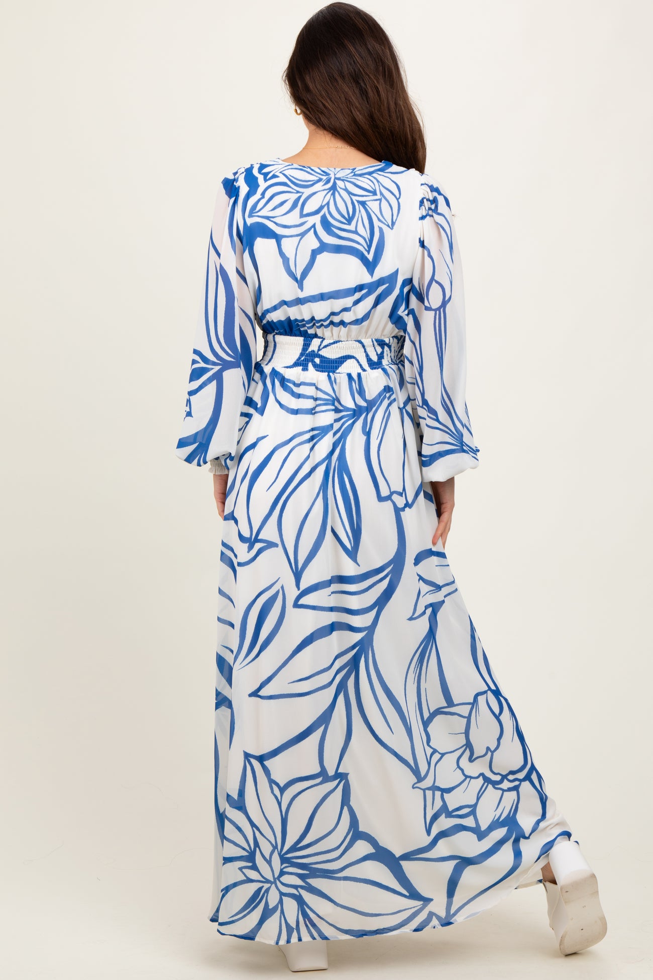 Blue Floral Smocked Waist Long Sleeve Maxi Dress