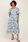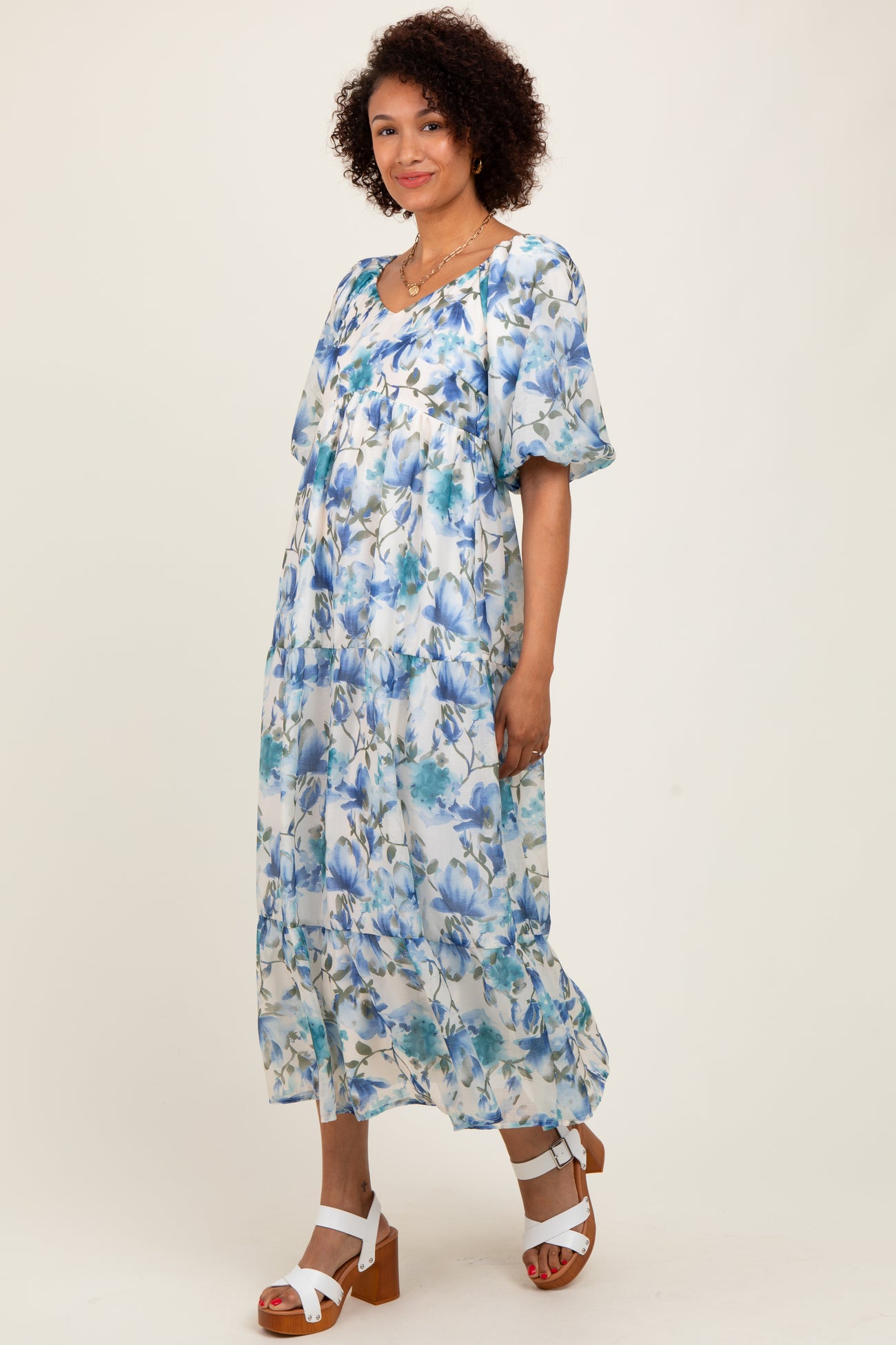 Blue Floral Tiered Puff Sleeve Midi Dress