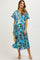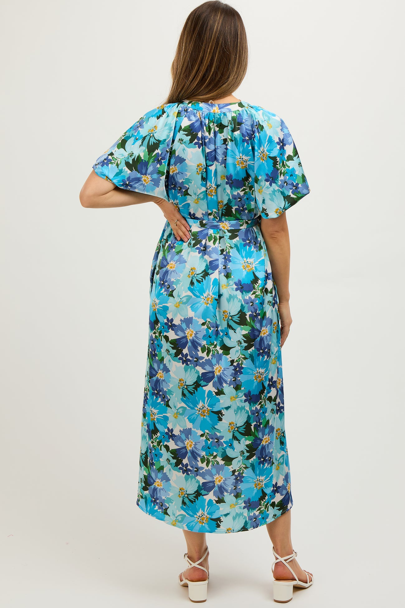 Blue Floral V-Neck Short Puff Sleeve Tie Waist Satin Maternity Midi Dress