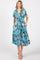 Blue Floral V-Neck Short Puff Sleeve Tie Waist Satin Midi Dress