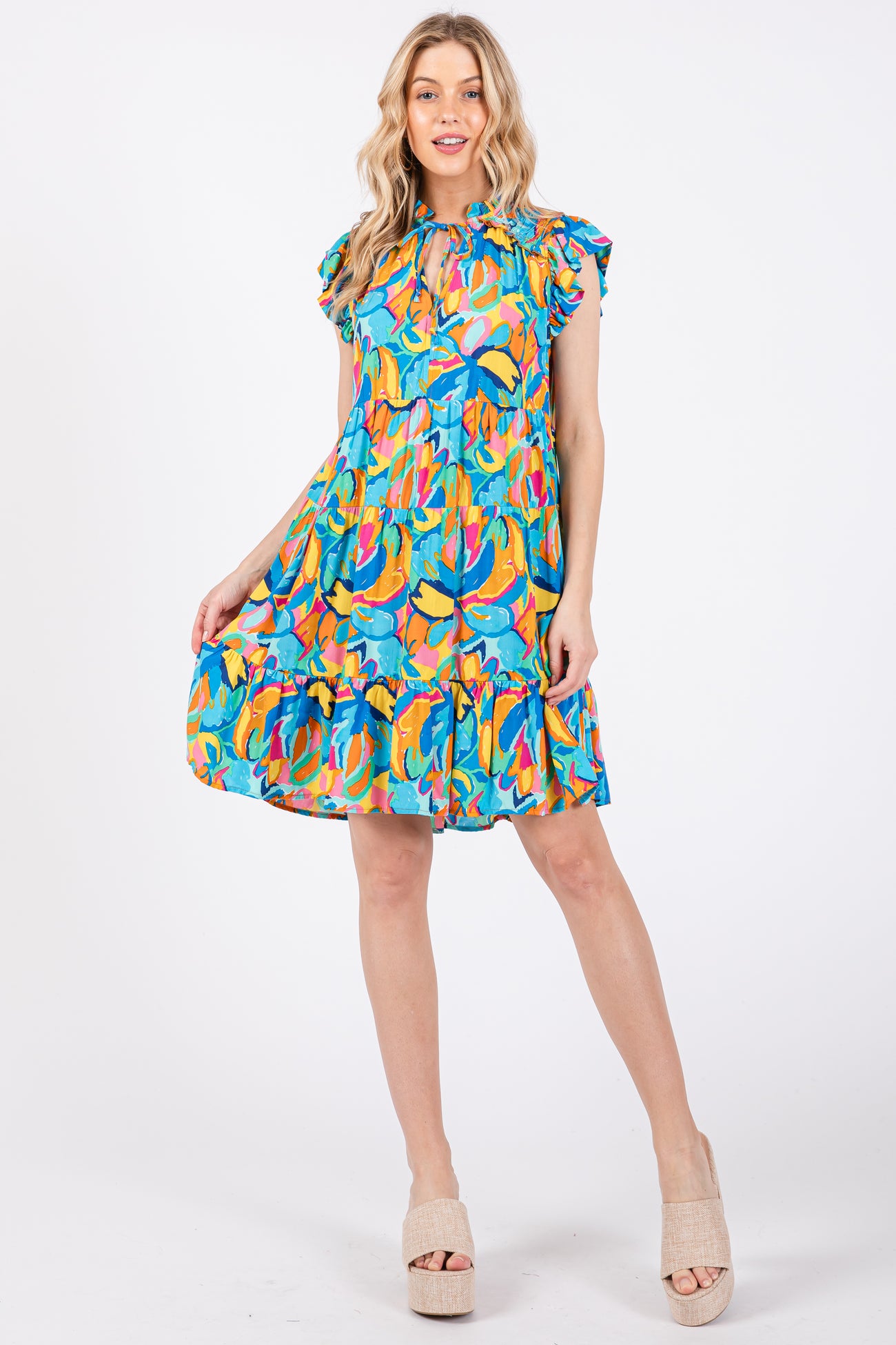 A printed dress with a v-neckline, a front neck tie, ruched shoulder accents, ruffle accent cap sleeves, and a tiered skirt.