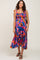 A printed maternity midi dress with a smocked bodice, adjustable self tie straps, and ruffle trim. Dress is partially lined.