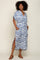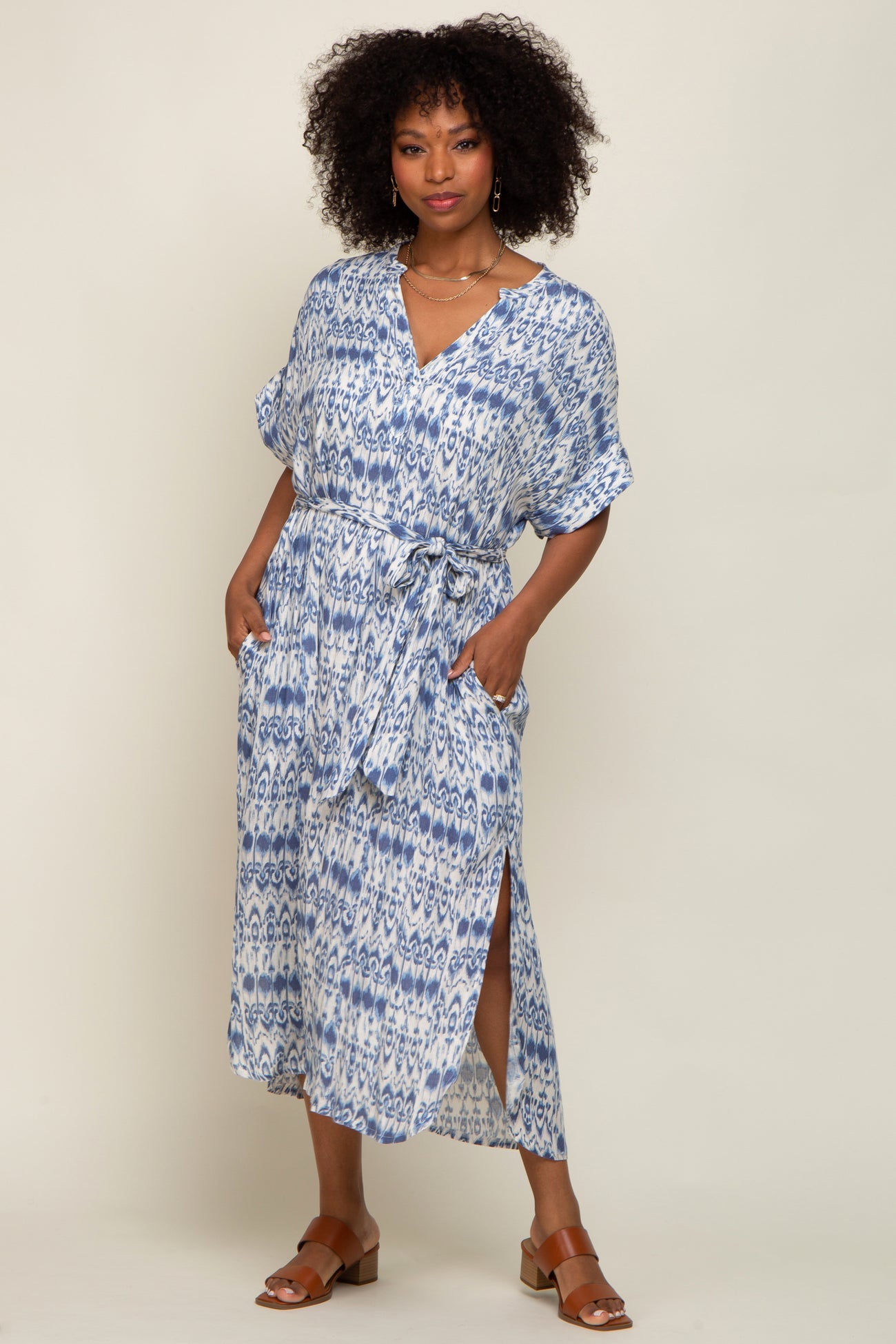 A printed midi dress with a split v-neckline, cuffed short dolman sleeves, a waist tie, side pockets, and side slits. Dress is lined.