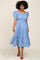 A solid hued midi dress featuring a smocked top, shirt off sleeves, a tiered skirt, a self-tie open back and a rounded neckline.