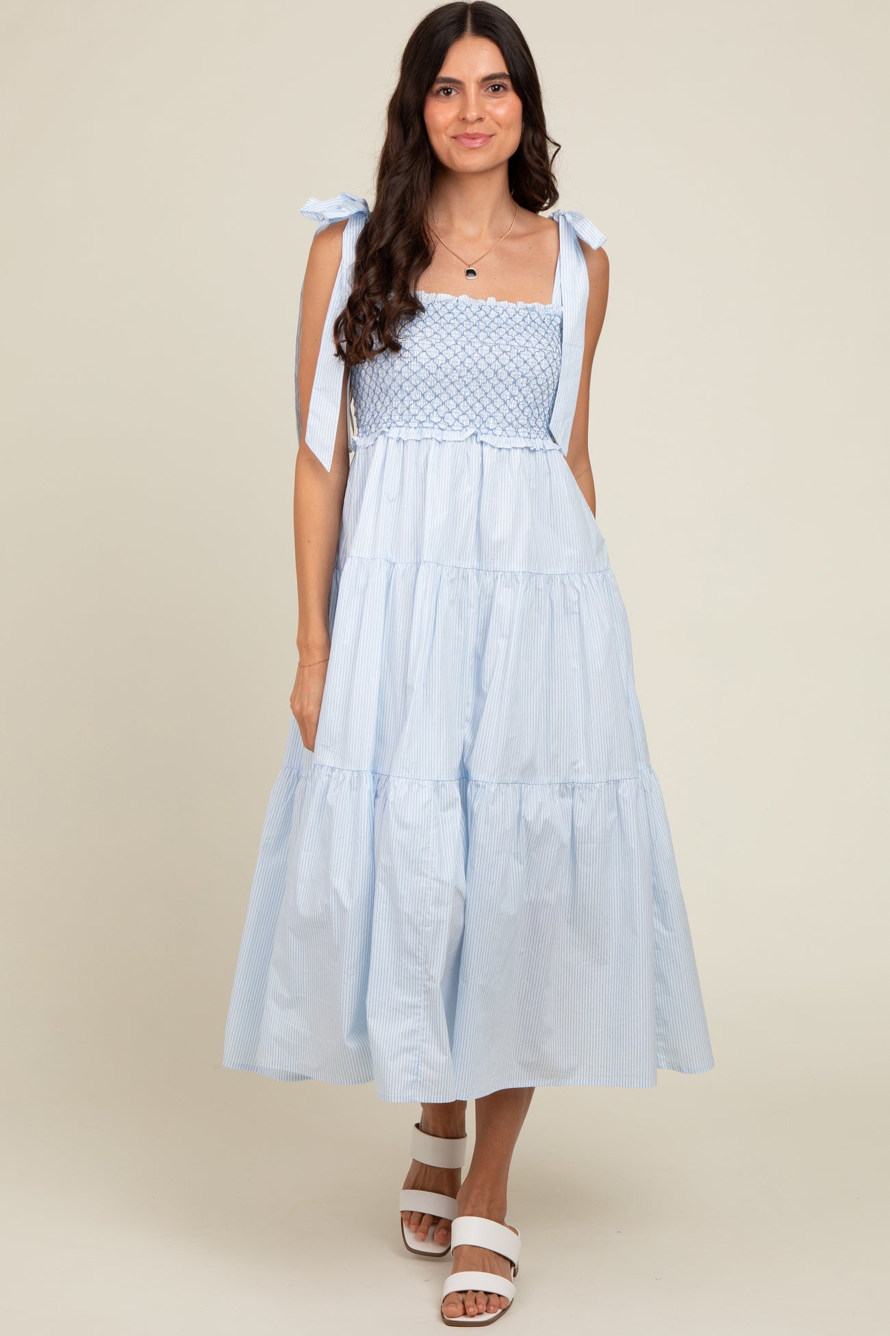 Blue Striped Smocked Tie Strap Midi Dress