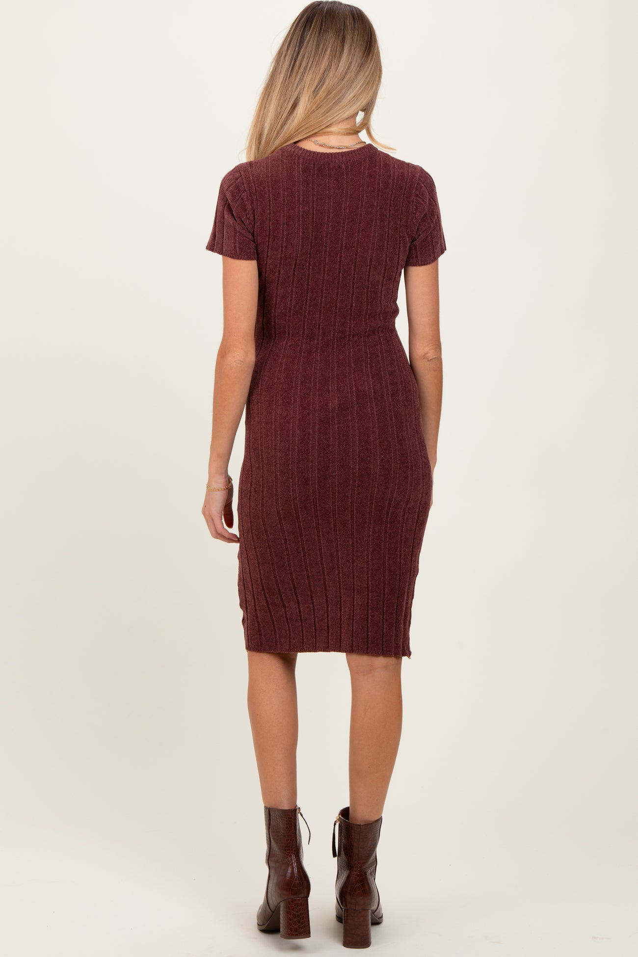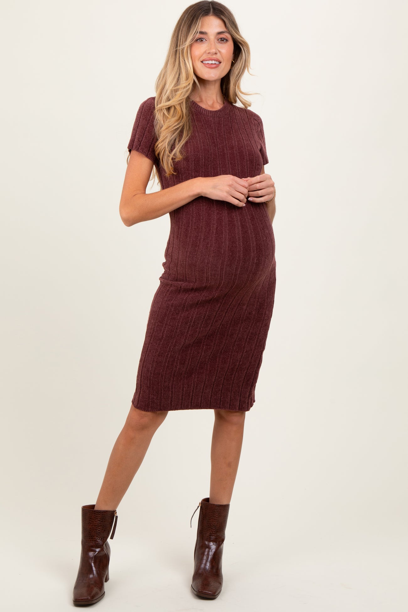 Brown Chenille Knit Short Sleeve Maternity Sweater Dress