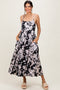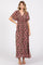 A floral maxi dress with a wrap v-neckline, short flounce sleeves, and a smocked waist band. Dress is lined on the top front and skirt to prevent sheerness.