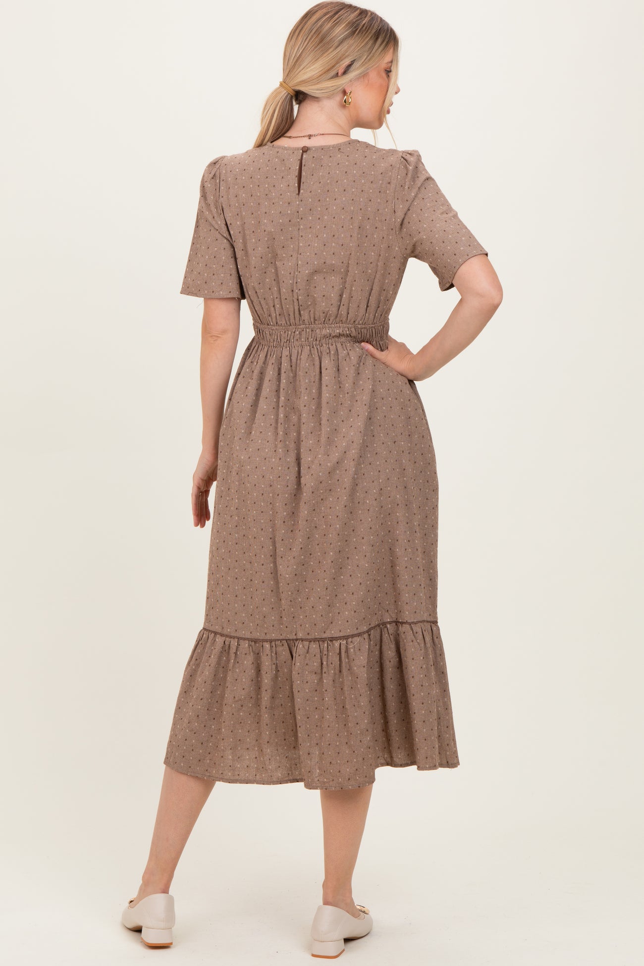 Step into timeless elegance with our Brown Houndstooth Lace Midi Dress. Featuring a delicate houndstooth lace pattern in a warm brown hue, this dress offers a flattering cinched waist and soft gathers for a comfortable, feminine silhouette. The midi length and short sleeves provide modest coverage, making it perfect for both daytime outings and evening events. With practical side pockets and a flowy ruffled hem, this piece effortlessly combines style and function. Pair it with classic flats or heels for a chic, polished look that's ideal for any season.