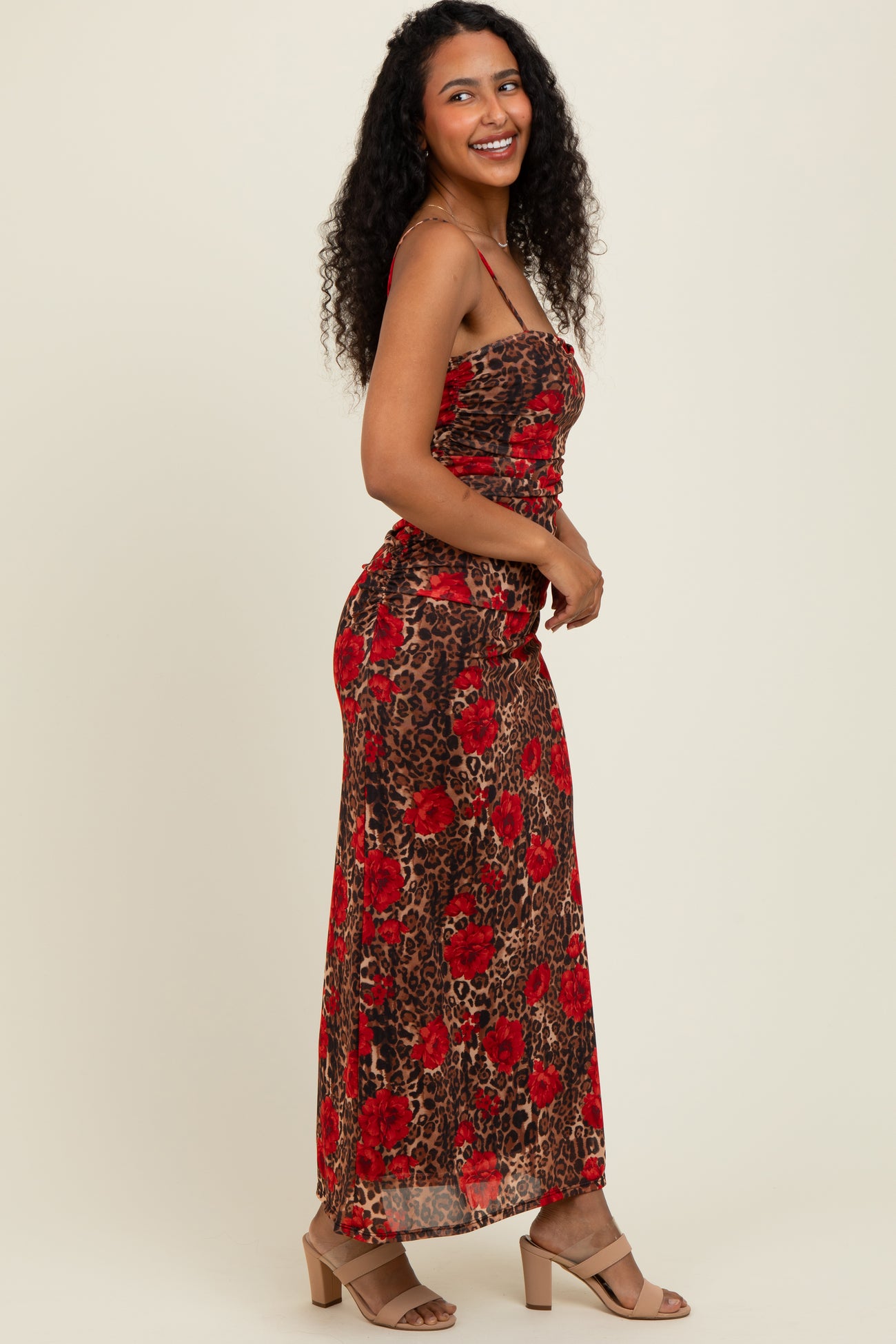 Brown Leopard Floral Mesh Ruched Sleeveless Maxi Dress