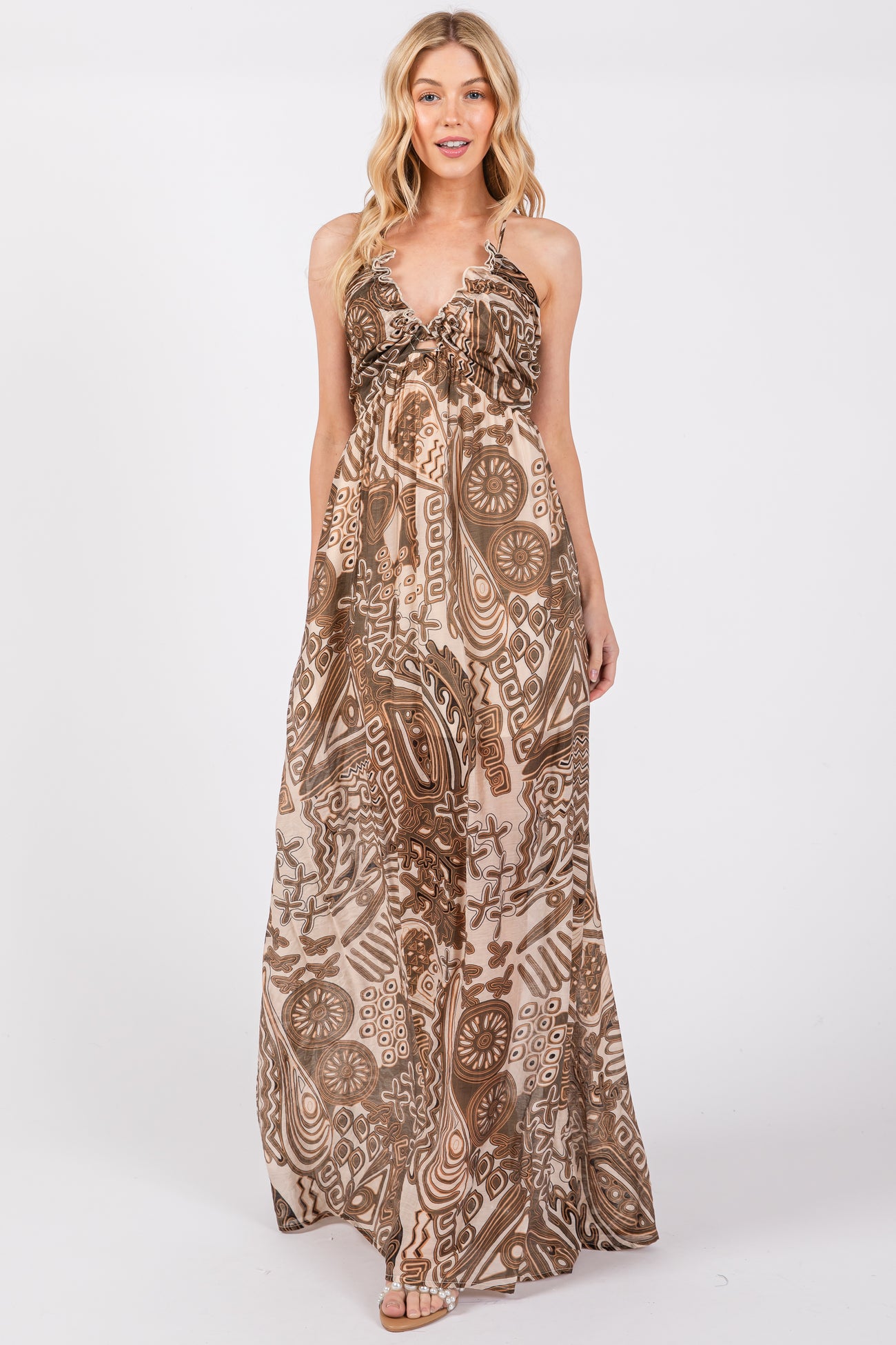Brown Printed Halter Cutout Maxi Dress