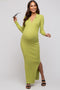 A ribbed knit midi dress featuring a mock neckline, long sleeves and a button up side slit.