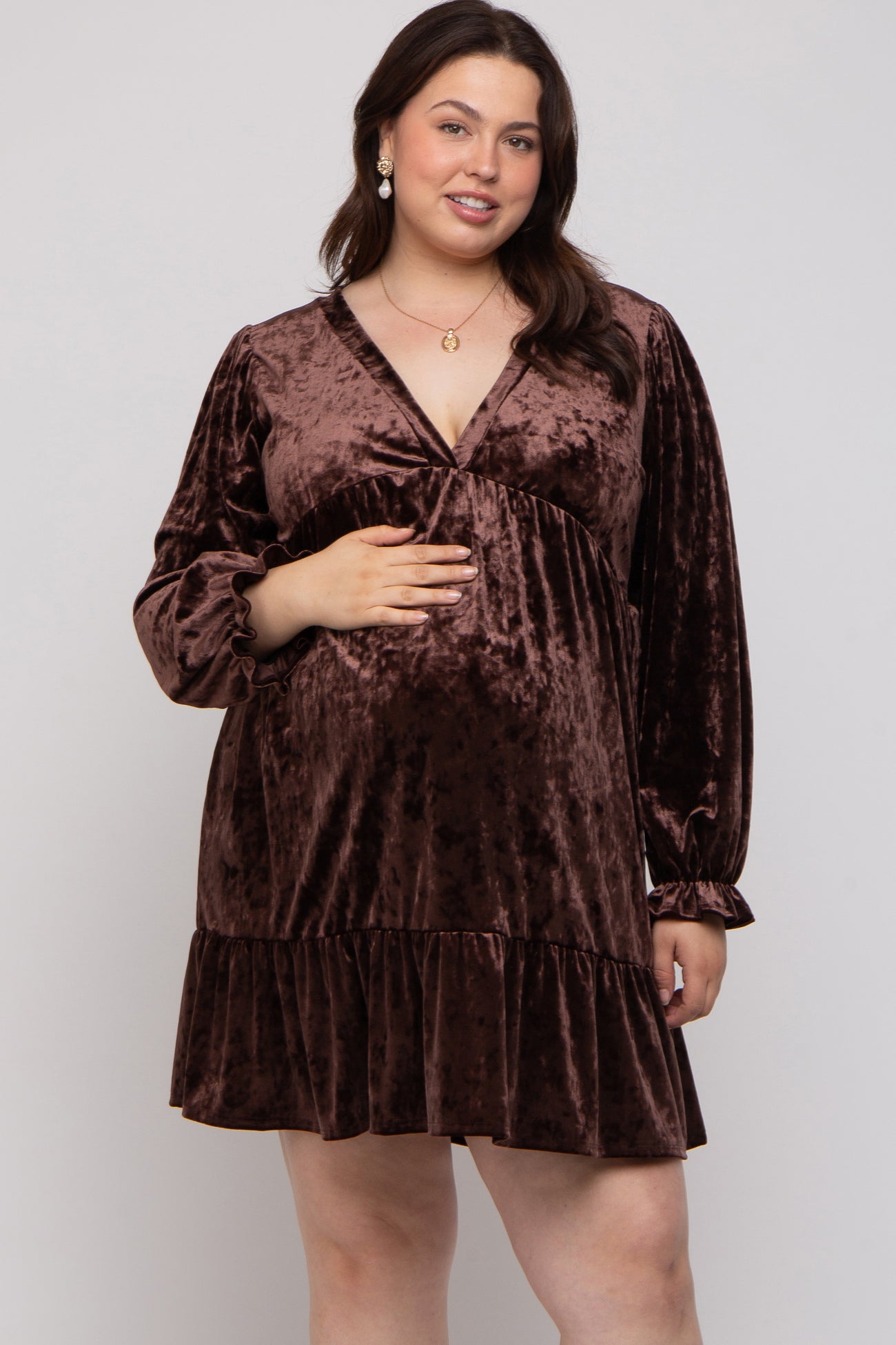 Brown Velvet Long Sleeve Maternity Plus Dress