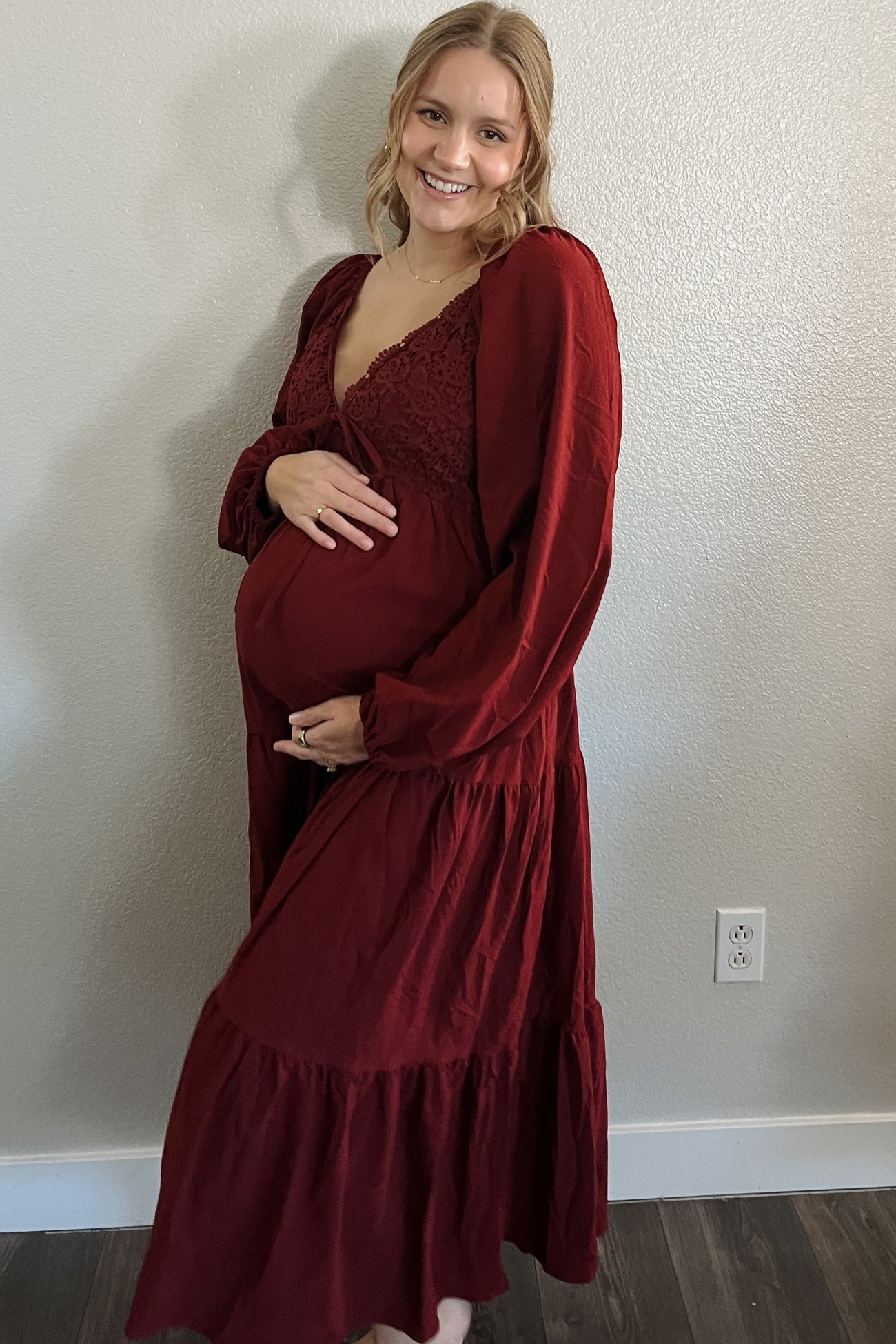 Burgundy Contrast Lace Bodice Tiered Maternity Midi Dress