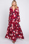 Burgundy Floral Chiffon V-Neck Lettuce Edge Tiered Maternity Maxi Dress