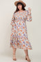 A floral print maternity plus size dress with a v-neckline, ruffle accent shoulders, long cinched sleeves, and a smocked bodice.