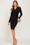 A solid hue dress featuring a ruched off shoulder neckline, long sleeves, and slight side ruching.