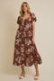 Camel Floral Long 3/4 Sleeve Tiered Midi Dress