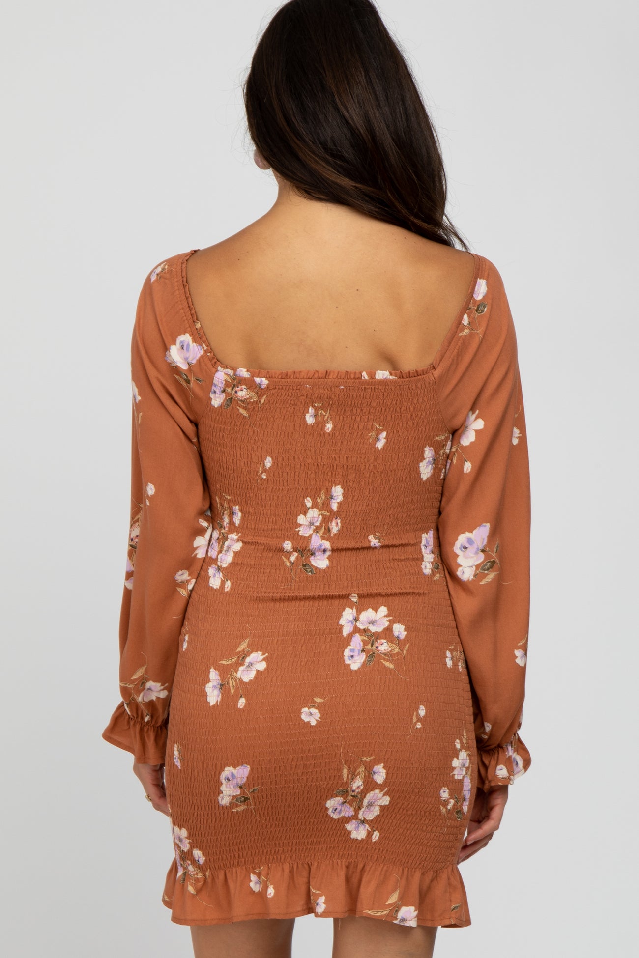 A floral print smocked dress featuring long ruffle sleeves, a tie front accent, and a ruffle hem.