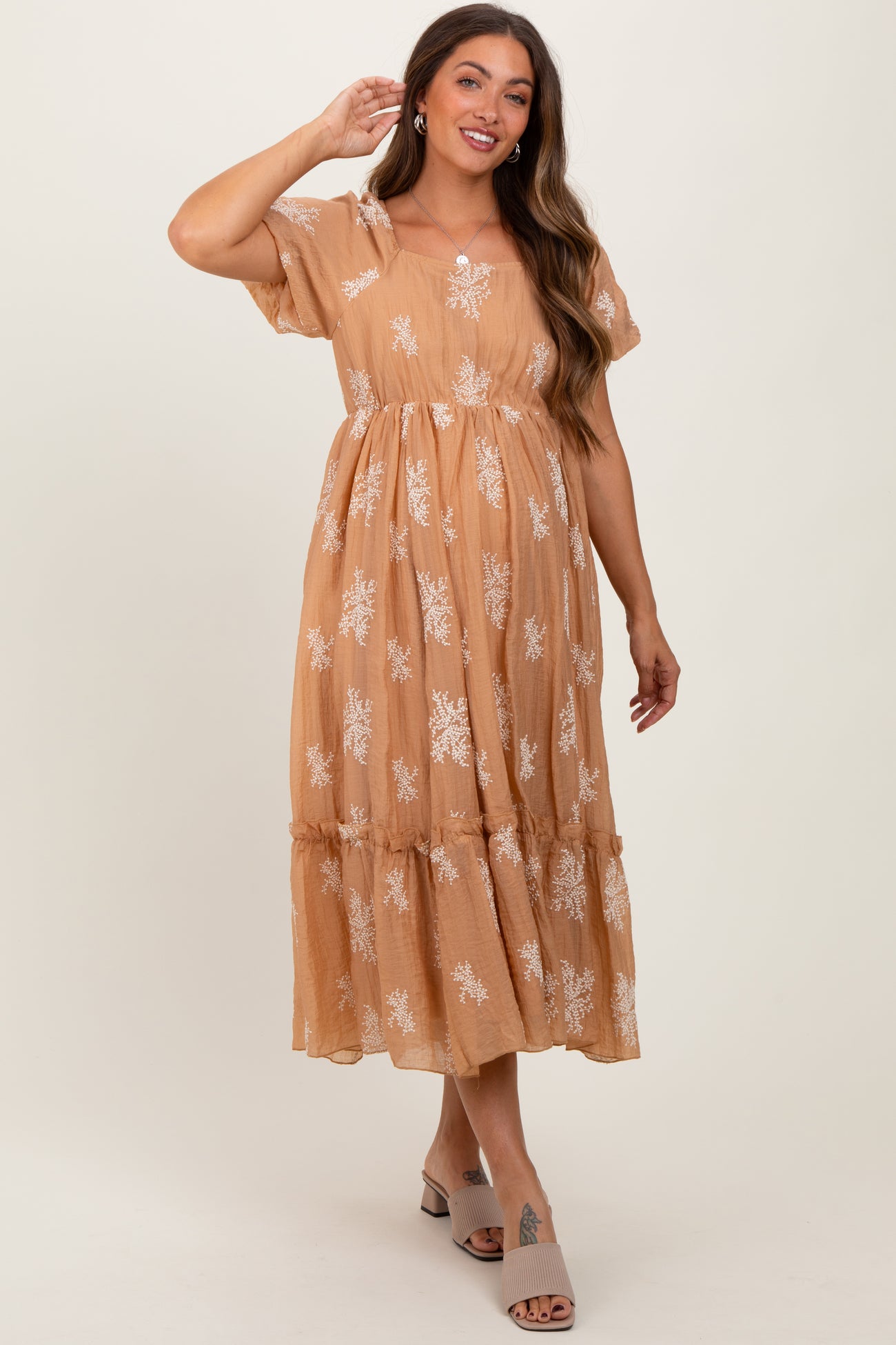 Camel Floral Print Ruffle Hem Maternity Midi Dress
