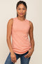 A basic solid tank top in a ribbed material with a higher neckline and rounded hem.