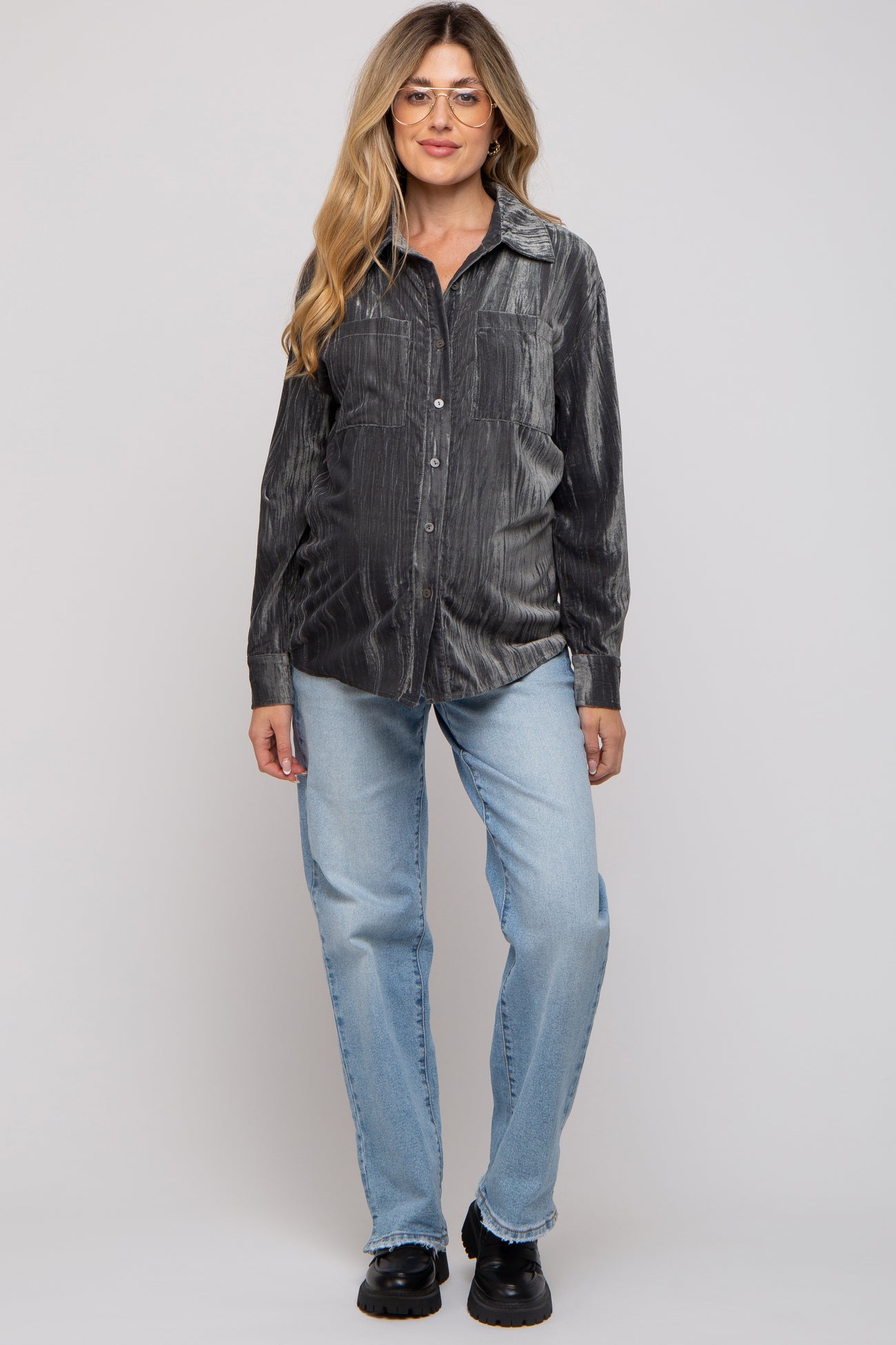 A pleated velvet maternity top featuring a collared neckline, a button up front, two front pockets and long sleeves.