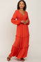 Details A solid maternity midi dress with a v-neckline, smocked bodice, bubble sleeves and tiered skirt. Skirt is double lined. Content + Care