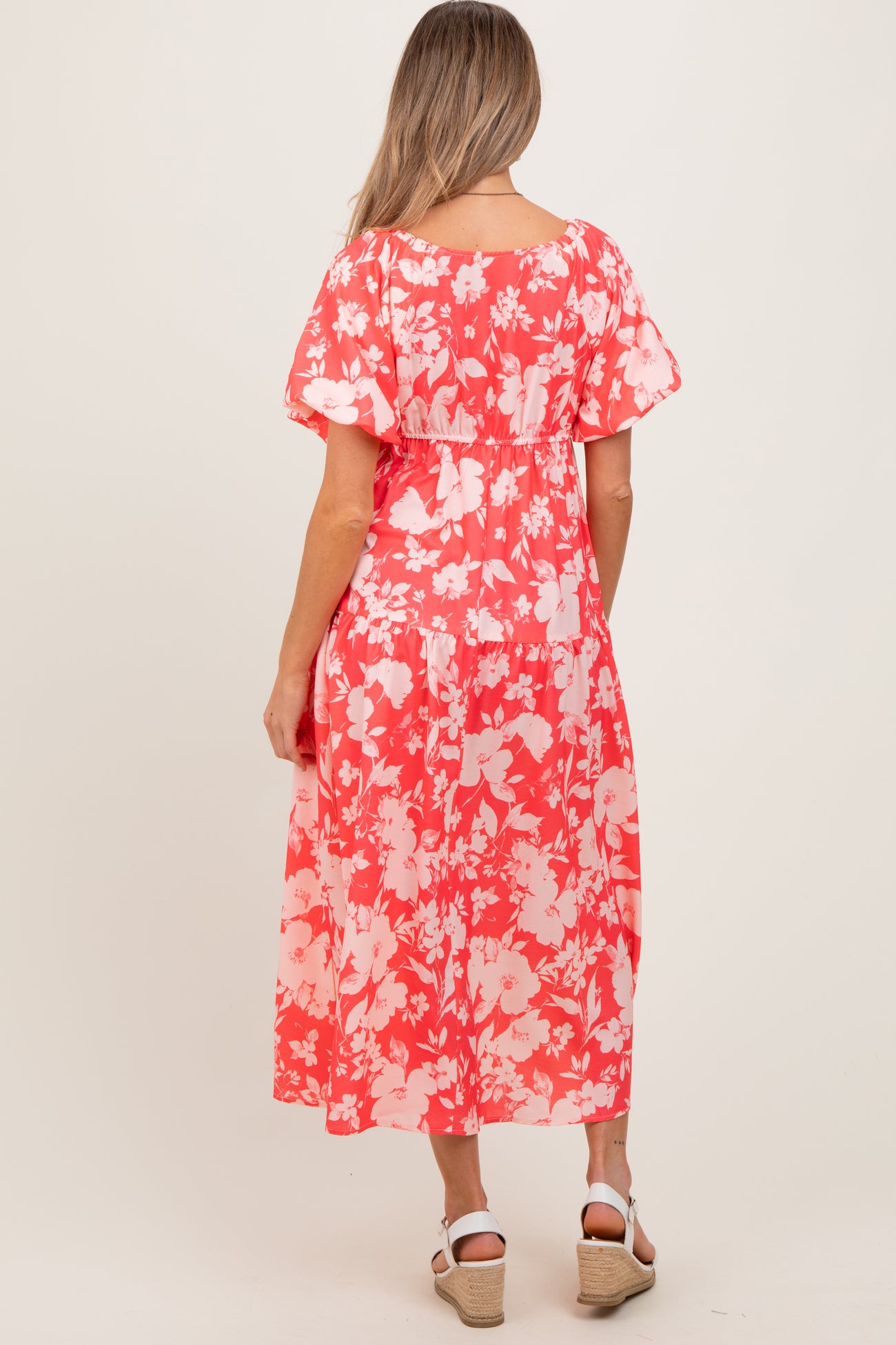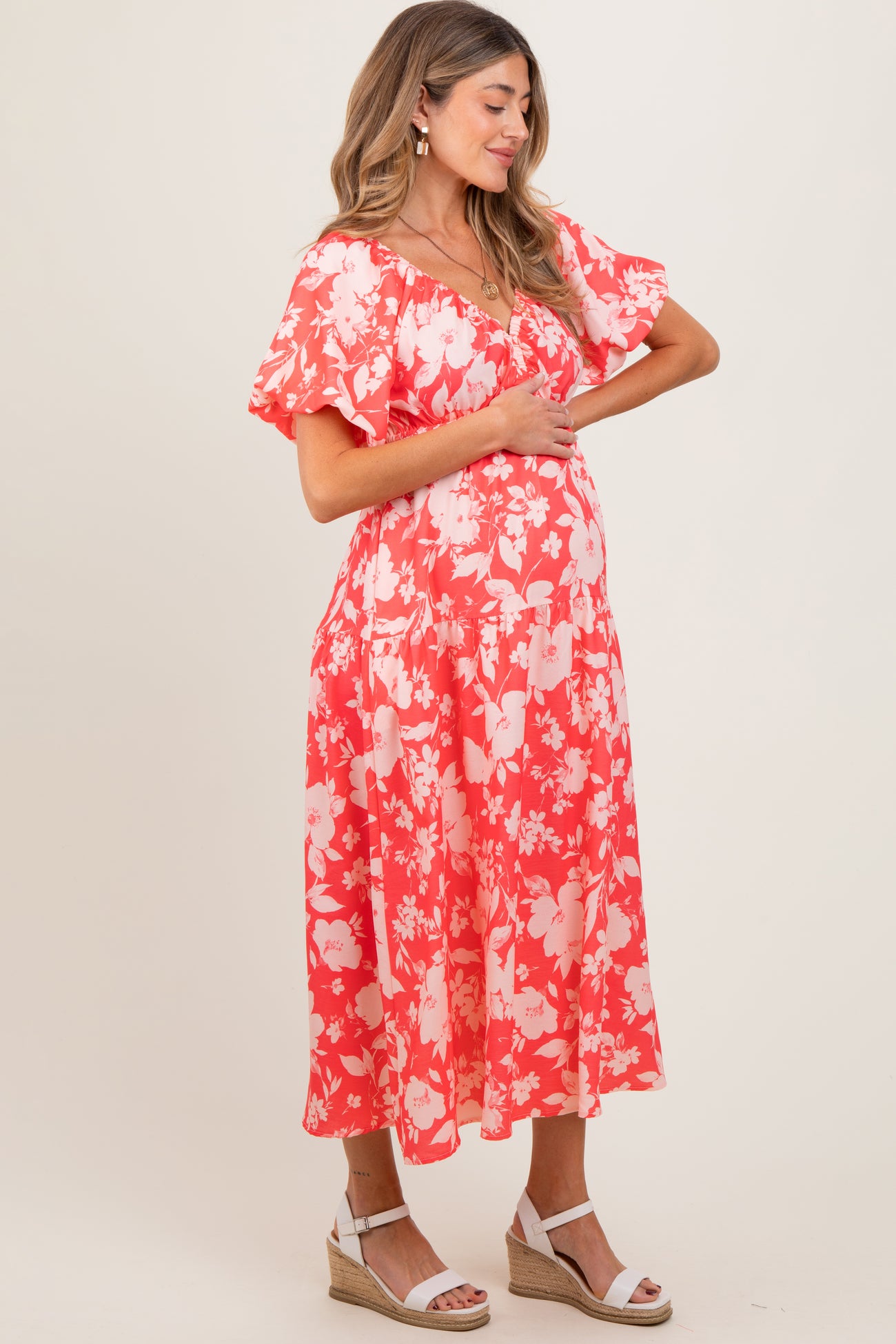 Coral Bubble Short Sleeve Maternity Maxi Dress W/ Side Pocket
