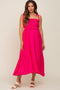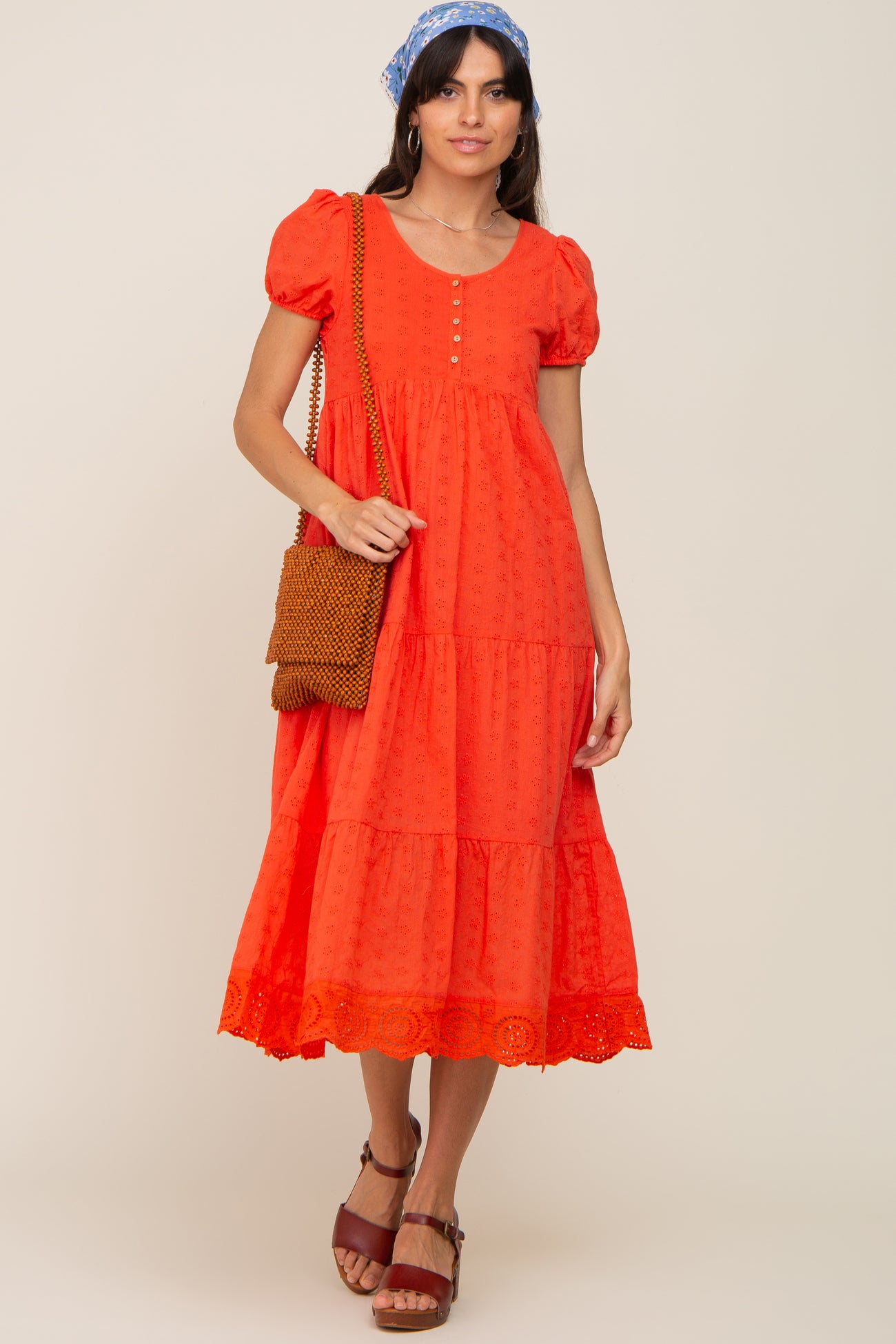 Coral Eyelet Button Front Tiered Scalloped Hem Midi Dress