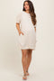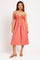 A knee-length dress with a cross front halter tie, a crochet top, and an eyelet skirt.