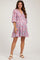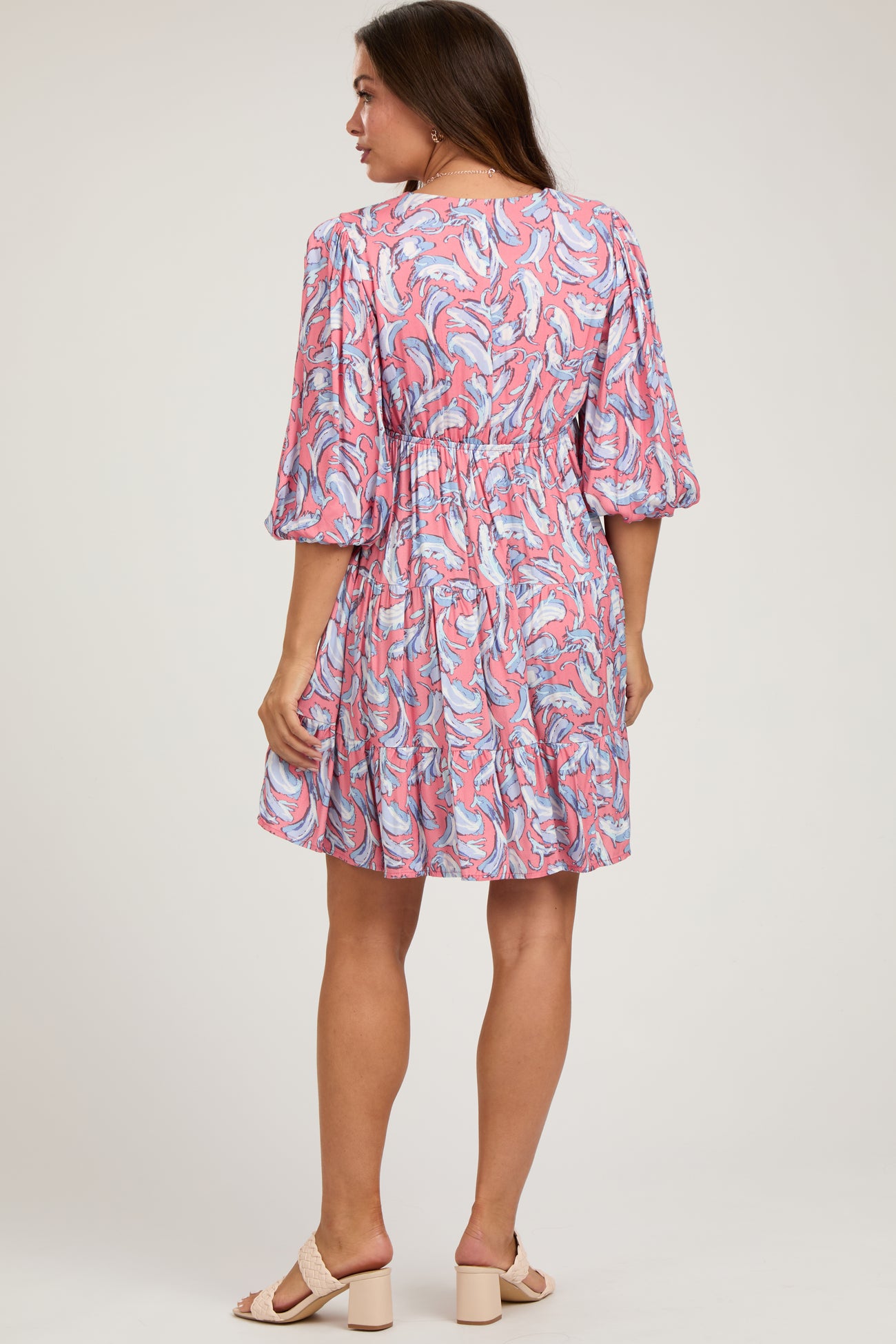 A printed maternity dress featuring short puff sleeves, a tiered skirt, a ruffle hem and a sweetheart neckline.