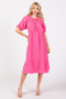 A solid hued maternity midi dress featuring short sleeves, a belted waist and a square neckline.