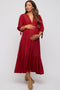 A solid ribbed knit midi dress with a mock neck, cutout detail on chest and back slit.