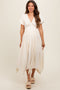 Cream Deep V-Neck Puff Short Sleeve Asymmetrical Hem Midi Dress