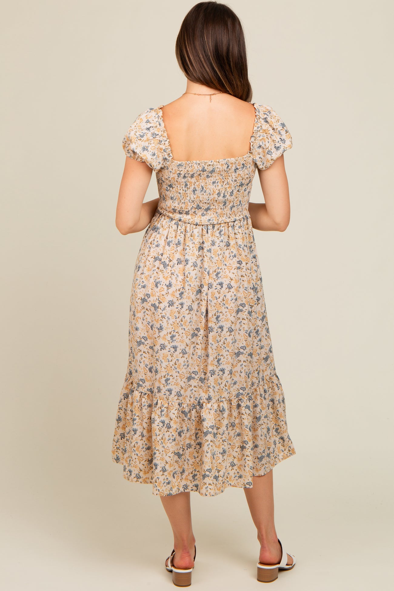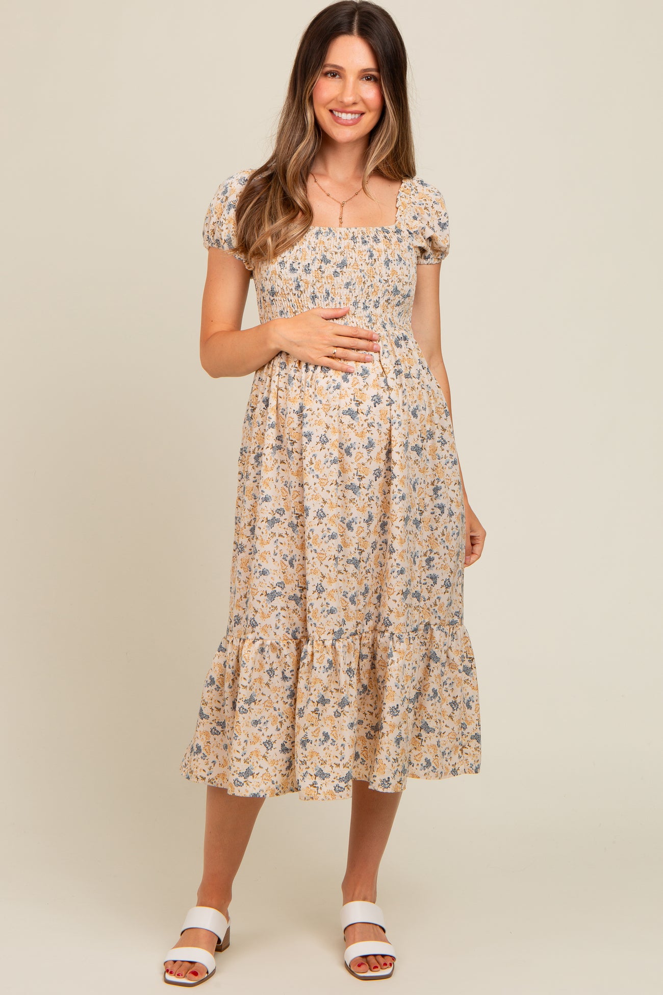 Cream Floral Smocked Ruffle Hem Maternity Midi Dress