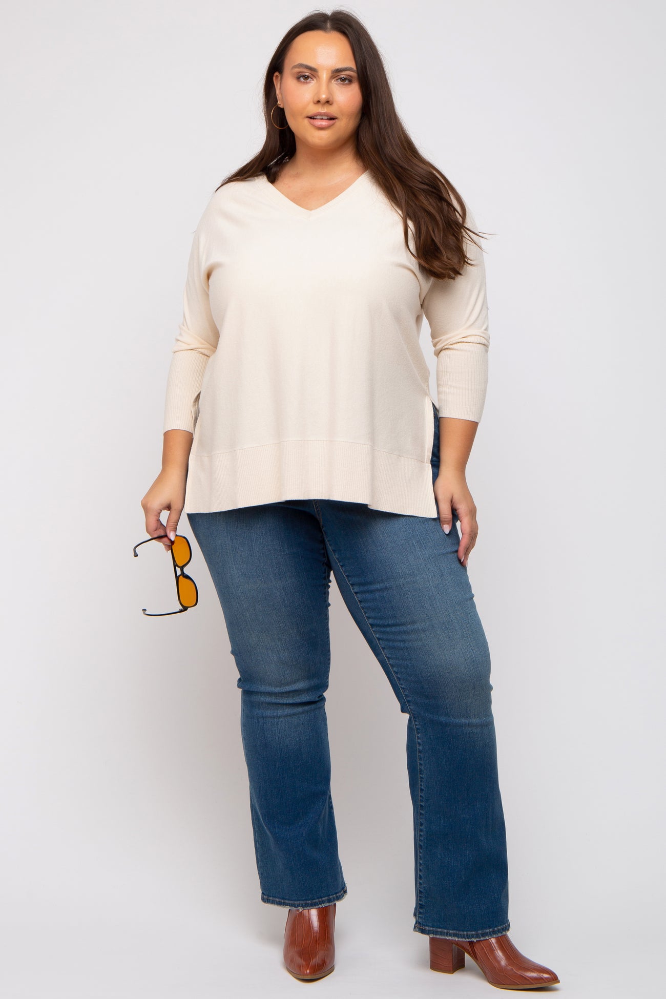 Details A solid hued knit plus top featuring long dolman sleeves, side slits and a v-neckline. Content + Care