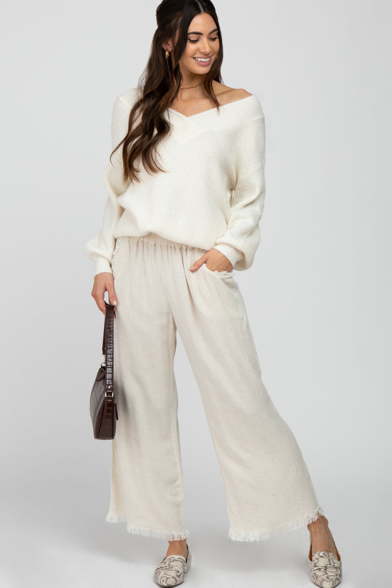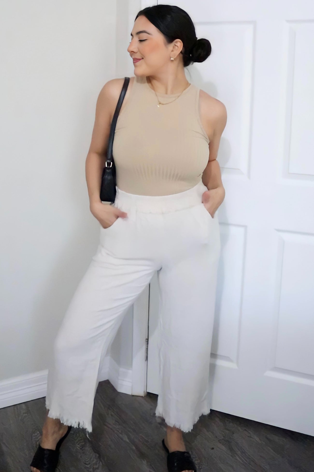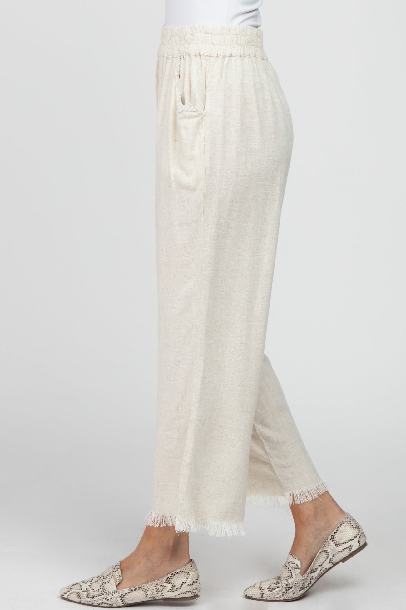 A pair of crop length, linen pants featuring an elastic waistband, side pockets and fringe trim.