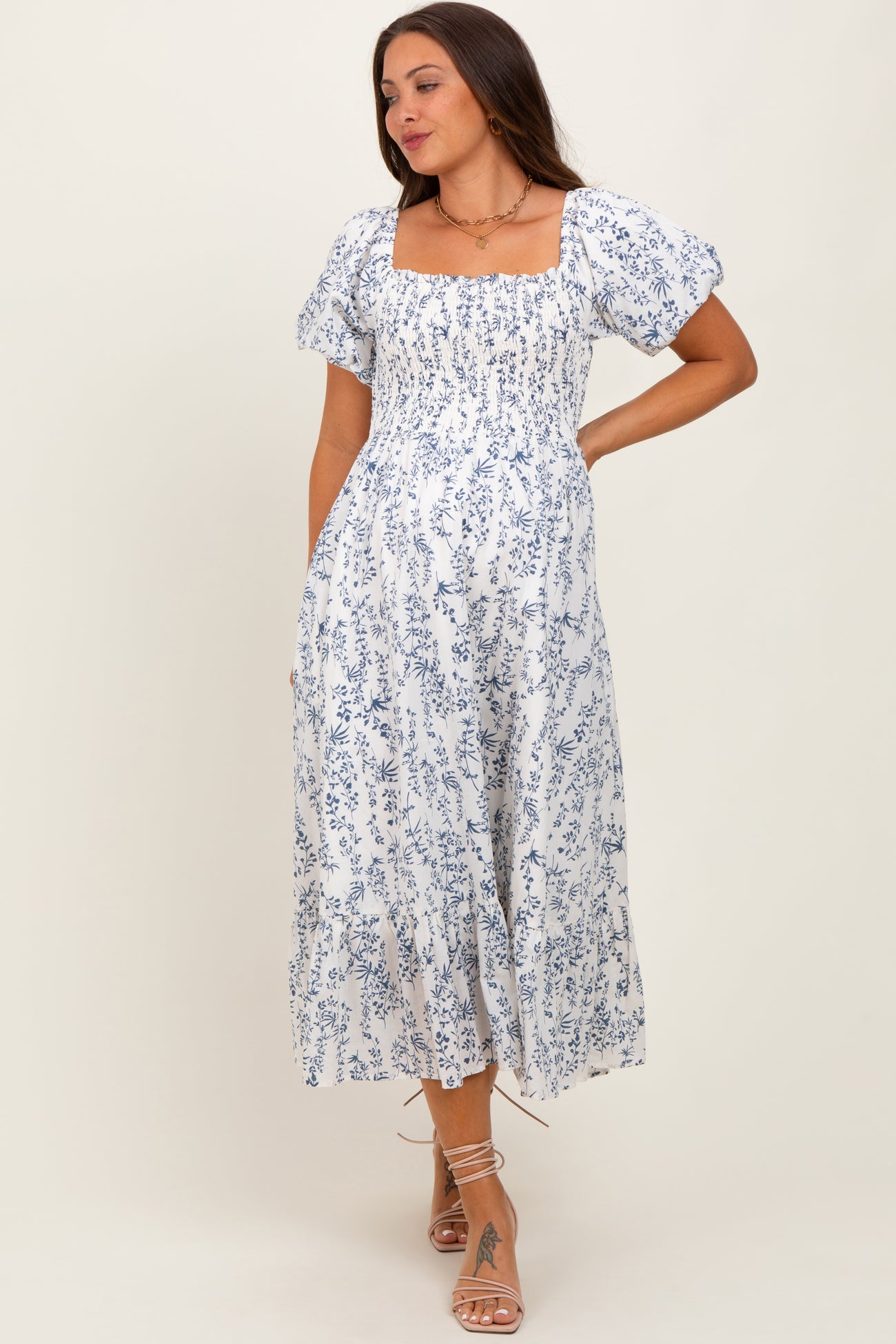 Cream Navy Leaf Printed Smocked Maternity Midi Dress
