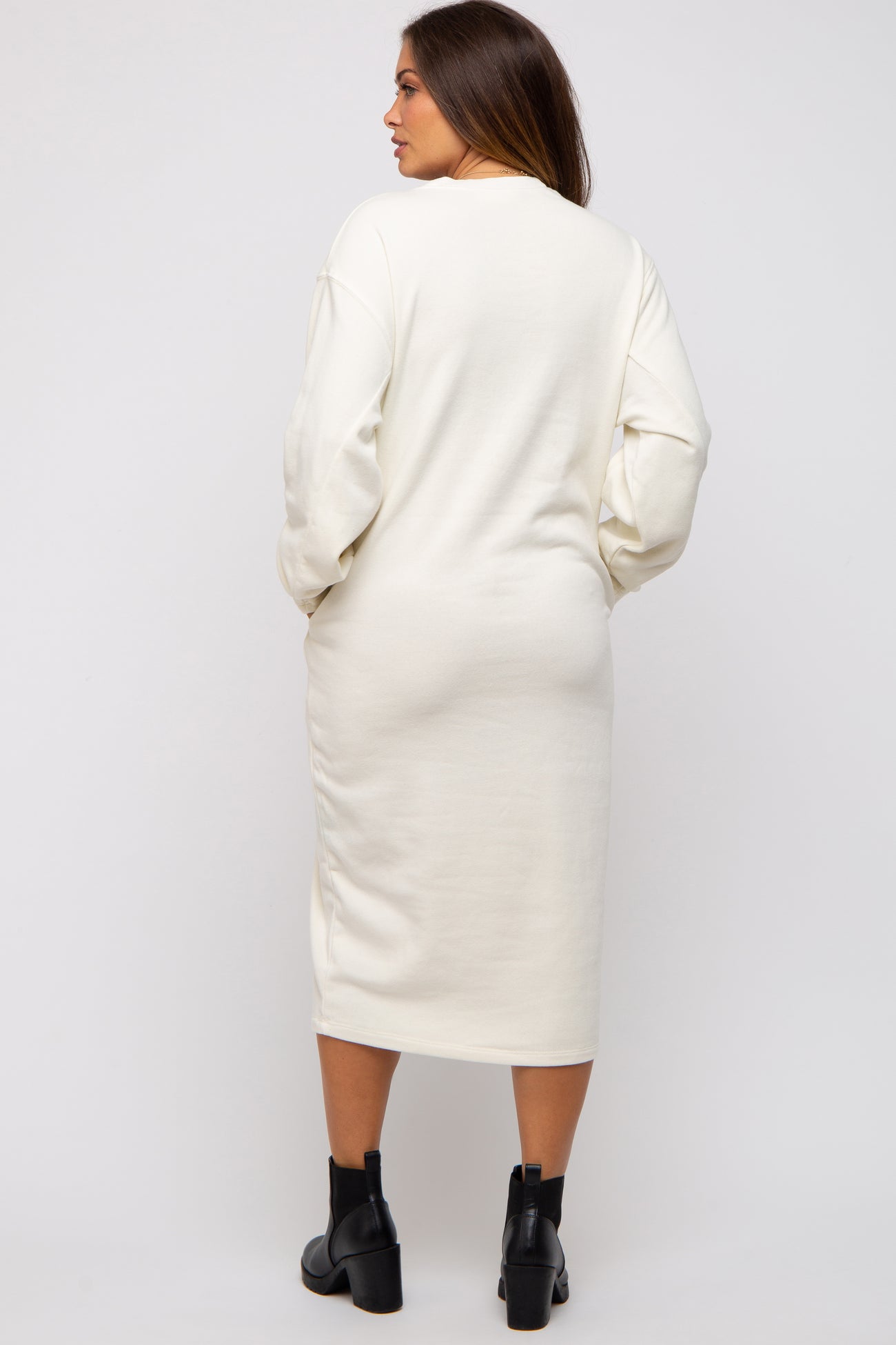 A solid oversized maternity sweatshirt dress in a midi length. Includes two side pockets.