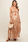 A paisley maternity maxi dress with a v-neckline, a later back tie, a front tassel tie, a smocked waist, and a tiered skirt. Dress is fully lined.
